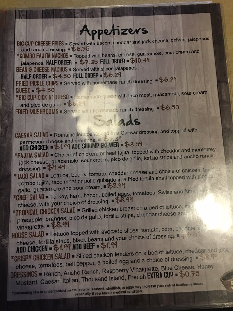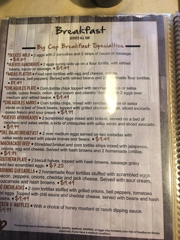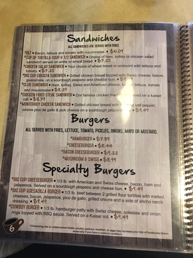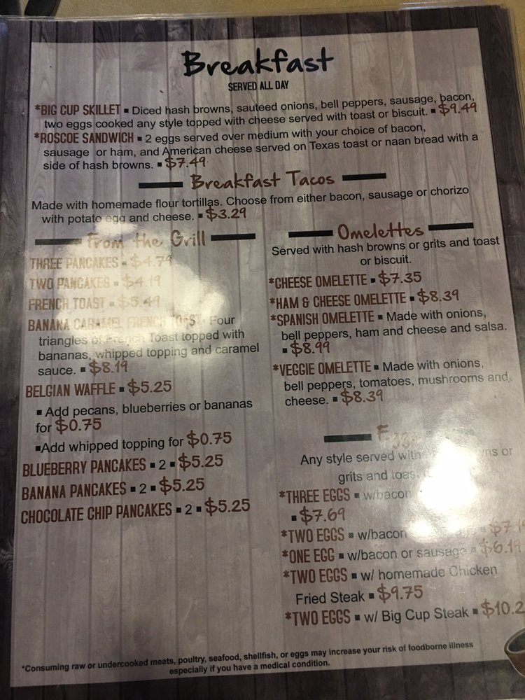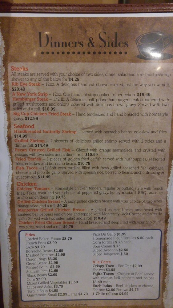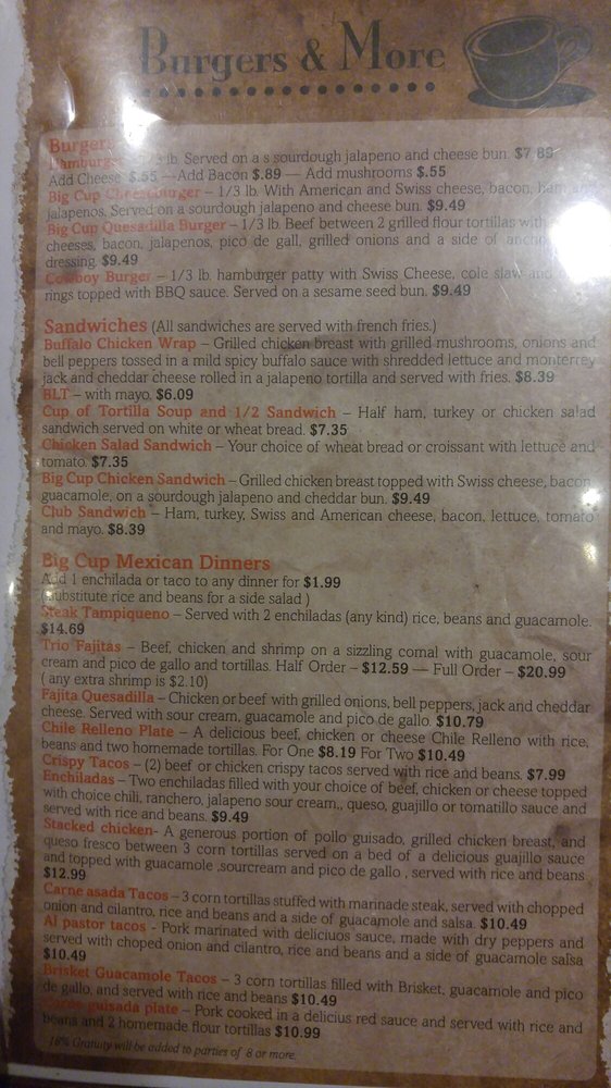 Welcome to Big Cup Eatery, a charming American-Mexican restaurant located in Glen Rose, TX. This casual eatery offers a variety of delicious dishes for breakfast, lunch, and dinner, along with many vegetarian options. The Big Cup Breakfast Specialties are a must-try, including the flavorful Breakfast Tacos made with homemade flour tortillas. Indulge in classic favorites like pancakes, French toast, and Belgian waffles, or opt for a unique twist with offerings like Banana Caramel French Toast. With amenities like outdoor seating, free Wi-Fi, and a full bar, Big Cup Eatery is the perfect spot for dining with friends and family. Don't miss out on this hidden gem's delectable menu and cozy atmosphere.